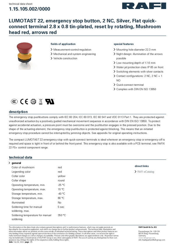 RAFI 1.15.105.002/0000 Wyłącznik awaryjny LUMOTAST 22, 2 NC, 1 szt.