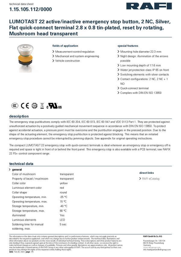 RAFI 1.15.105.112/0000 Wyłącznik awaryjny LUMOTAST 22, 2 NC, 1 szt.