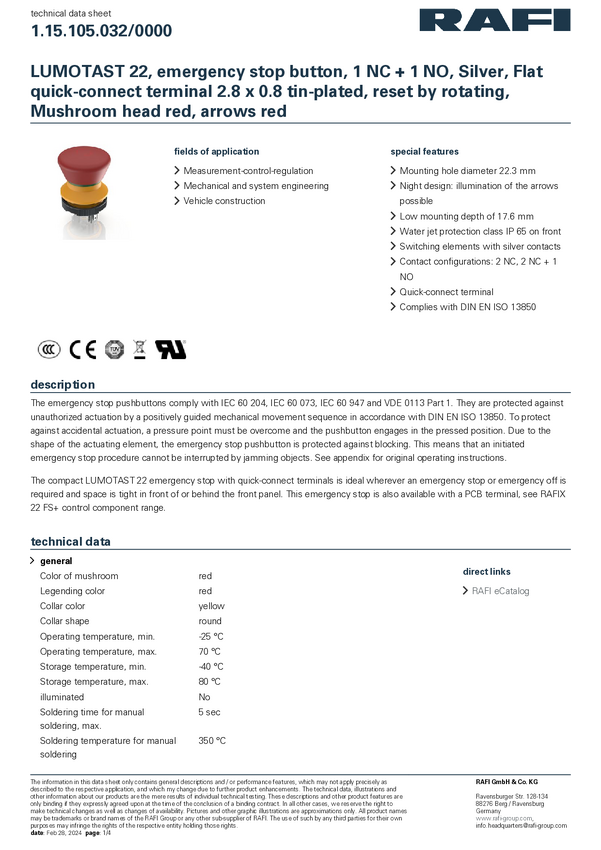 RAFI 1.15.105.032/0000 Wyłącznik awaryjny LUMOTAST 22, 1 NC, 1 NO, 1 szt.