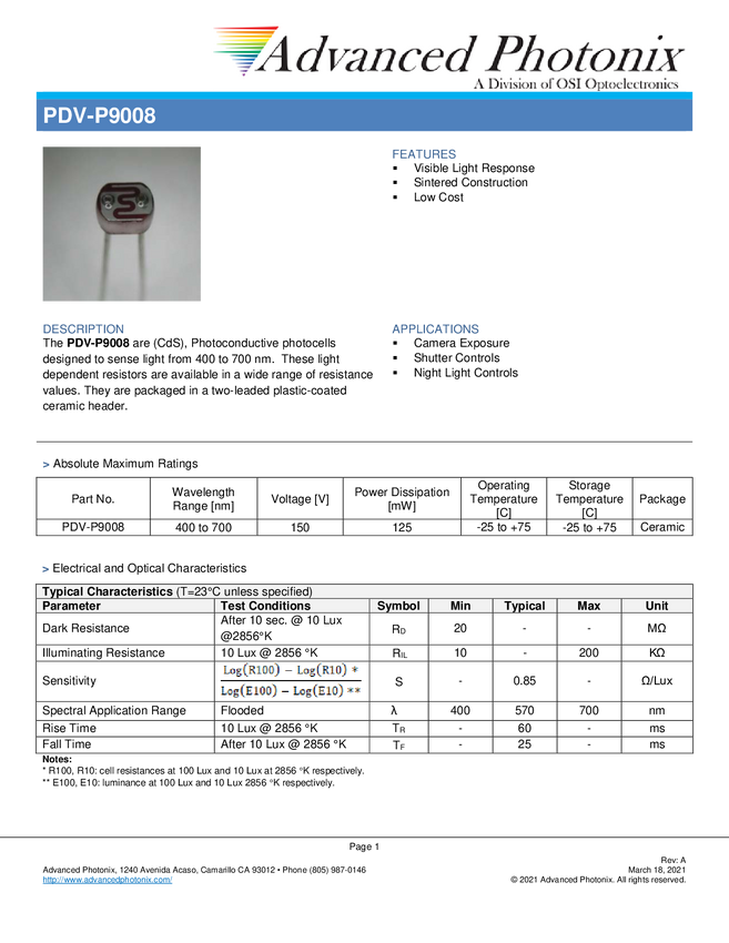 LUNA Optoelectronics PDV-P8103 Fotorezystor LDR THT 1 szt. 150 V (max) (D x S x W) 4.29 x 5.08 x 2 mm