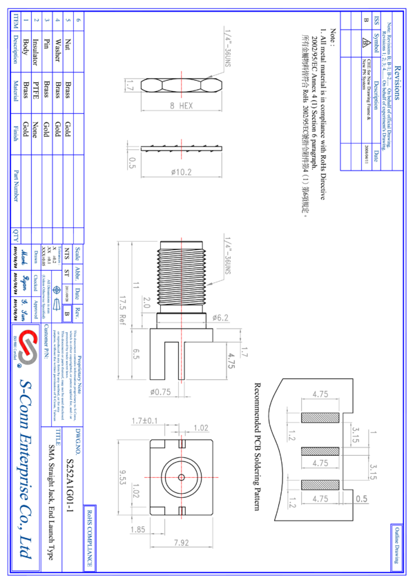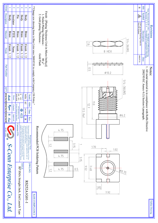 Złącze typu SMA-R252A, Reverse, krawędziowe proste, 50 Ohm, do PCB, lutowane, kontakt złocony , izolator teflon, korpus złocony