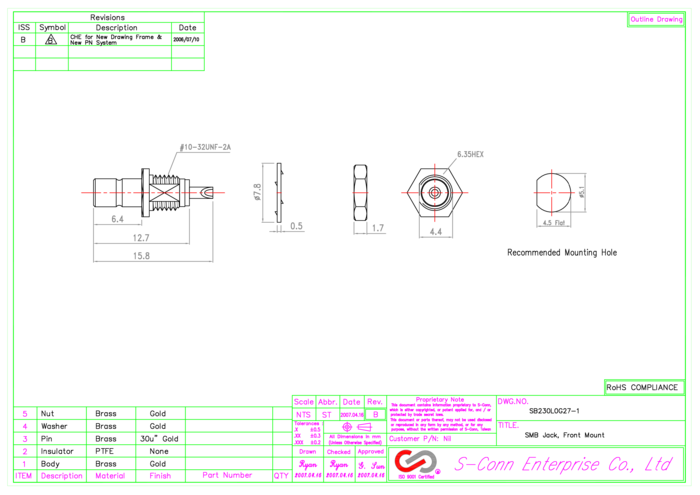 Złącze męskie SMB, proste, 50 Ohm, do obudowy, lutowany kabel, kołek złocony Au 30u", izolator teflon, korpus złocony