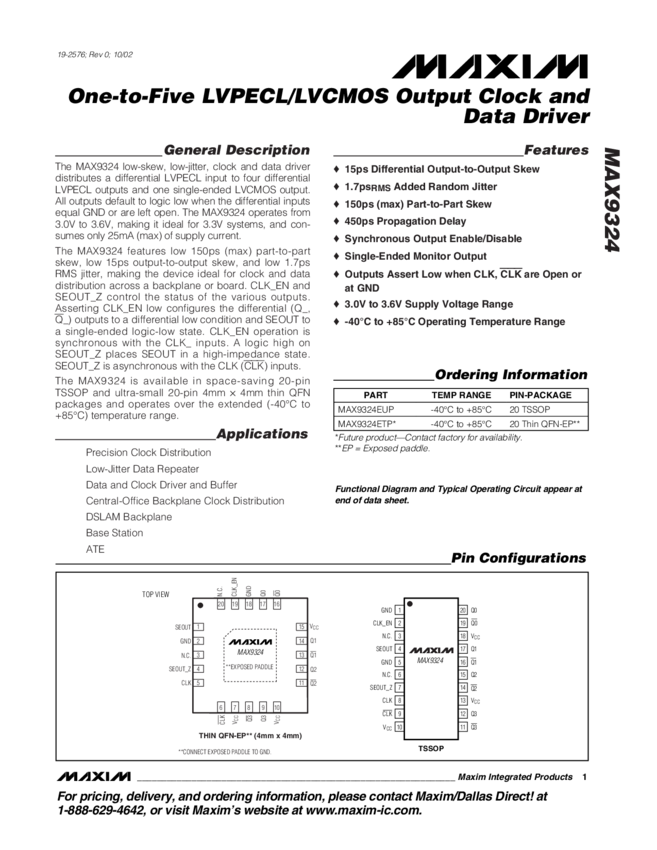 MAX9324 One to Five LVPECL/LVCMOS Output Clock and Data Driver