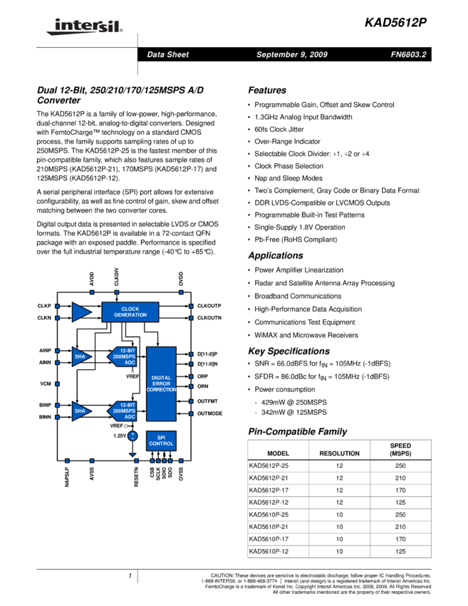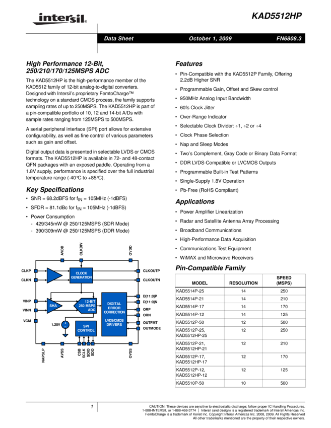 12-Bit, 250MSPS Single-Channel ADC with LVDS/LVCMOS Outputs