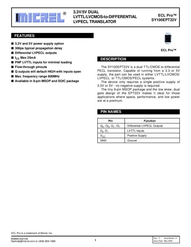 SY100EPT22V - 3.3V/5V DUAL LVTTL/LVCMOS-to-DIFFERENTIAL LVPECL TRANSLATOR