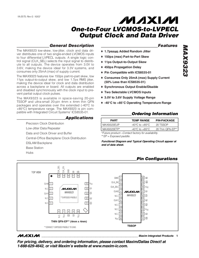 MAX9323 One to Four LVCMOS to LVPECL Clock and Data Driver