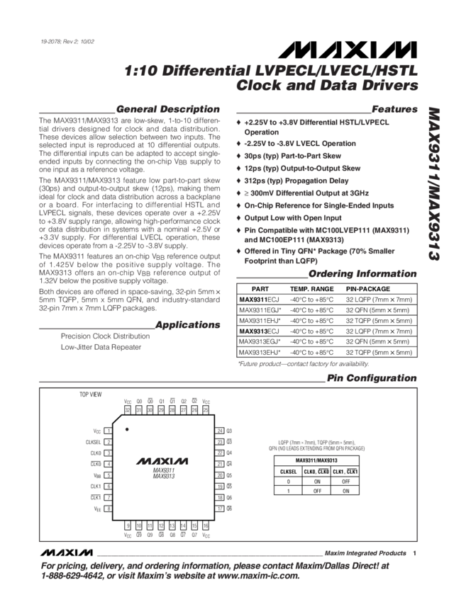 MAX9313 1:10 Differential LVPECL/LVECL/HSTL Clock and Data Drivers