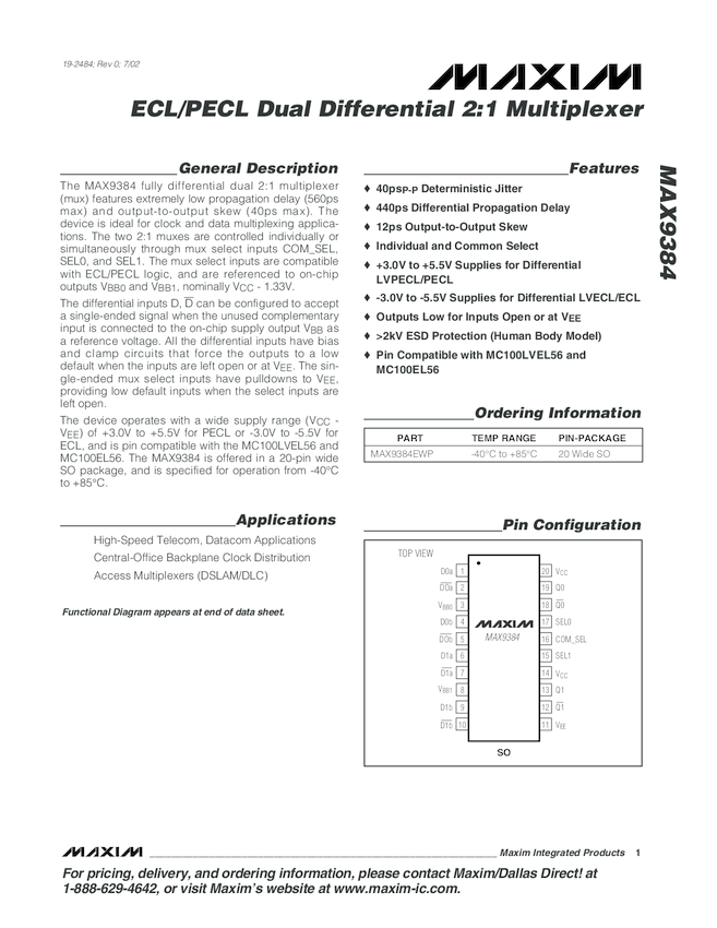 MAX9384 Dual Differential 2:1 LVECL/LVPECL Multiplexer