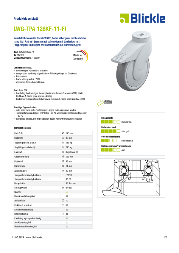 Kółko Blickle LWG-TPA 101K-11-FI-FK, średnica 125 mm, hamulec, poliamid, guma