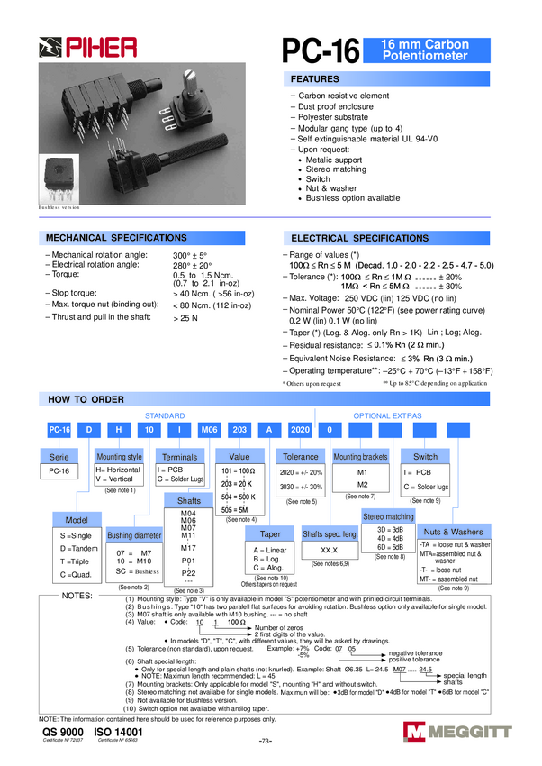 Potencjometr liniowy z wyłącznikien rezystancja 5,0 Kohm Model PC16 Piher - węglowy; Bushing M10x0,75; ośka plastyk 6mm, dł.ośki 45mm, wymiary: szer.16mm, wys 8+12,5mm; gł.13,6 mm; wył. 1A 250V,kąt 30st; kąt.mech/el. 300/280 st; moc 0,2W