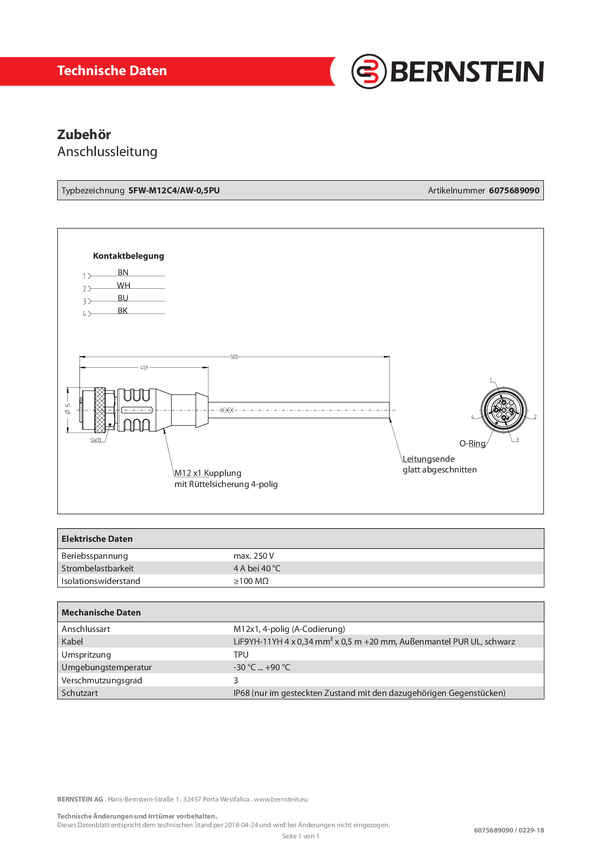 Kabel przyłączeniowy Bernstein S1W-M12C4/AW-5PU 1 szt.