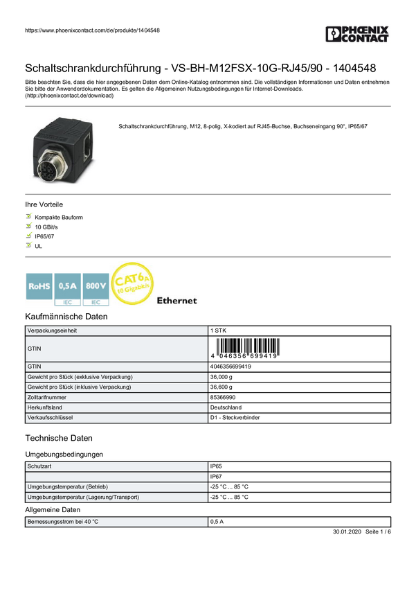 Phoenix Contact 1404548 Tuleja szafy sterowniczej VS-BH-M12FSX-10G-RJ45/90, piny: 8, 1 szt.