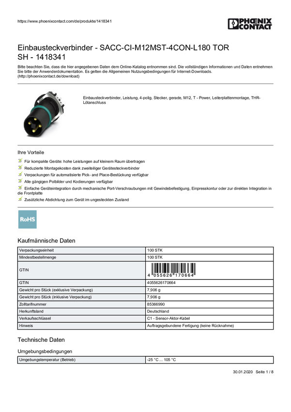 Phoenix Contact 1418341 Złącze okrągłe SACC-CI-M12MST-4CON-L180 TOR SH, 100 szt.