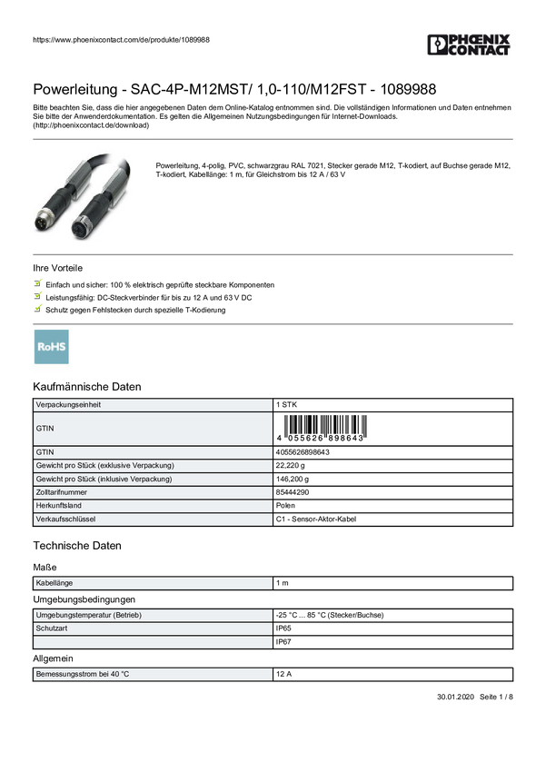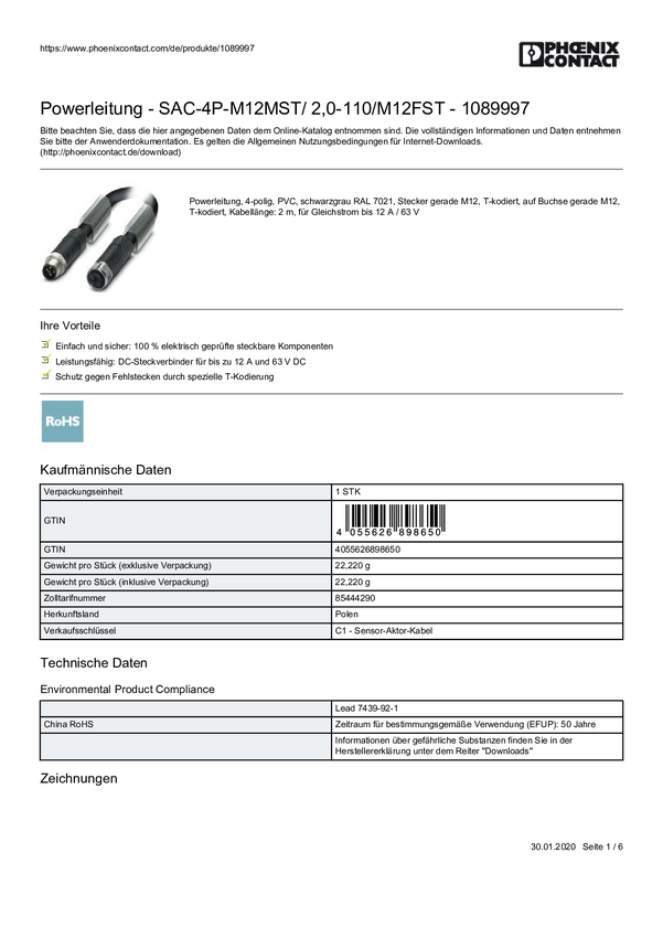 Phoenix Contact 1089953 Kabel połączeniowy czujnika/aktuatora SAC-4P-M12MST/ 2,0-110, piny: 4, 2.00 m, 1 szt.