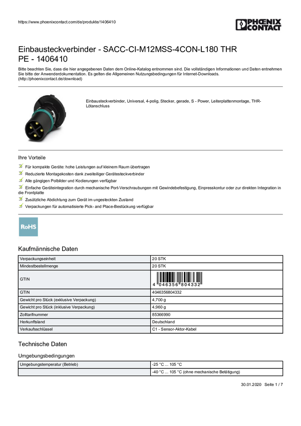 Phoenix Contact 1406410 Złącze okrągłe SACC-CI-M12MSS-4CON-L180 THR PE, 20 szt.