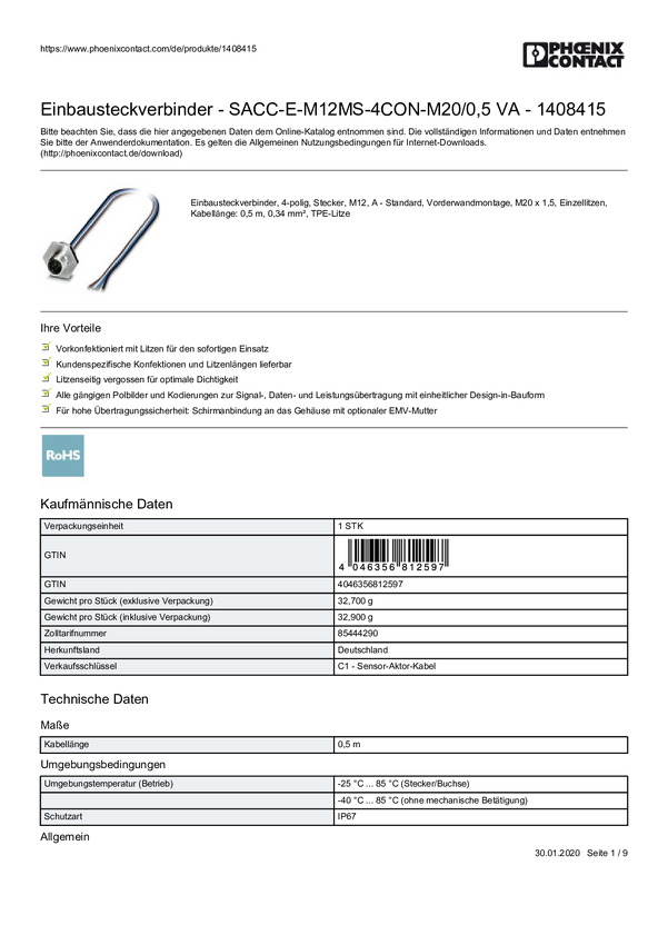 Phoenix Contact 1408415 Złącze czujnika/aktuatora do zabudowy SACC-E-M12MS-4CON-M20/0,5 VA, piny: 4, 0.50 m, 1 szt.
