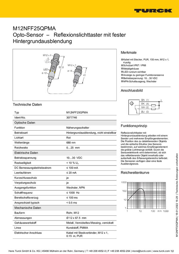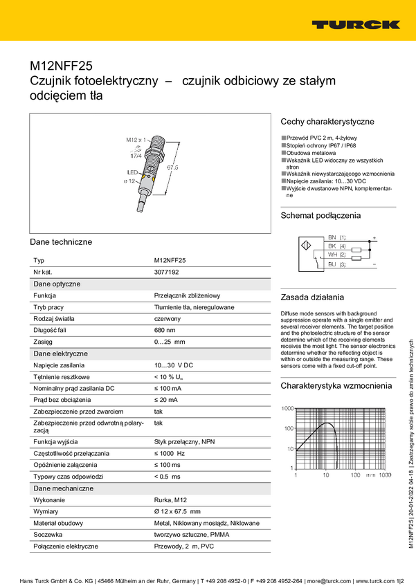 Czujnik dyfuzyjny Turck M12NFF25 3077192 1 szt.
