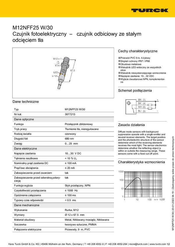 Czujnik dyfuzyjny Turck M12NFF25 W/30 3077213 1 szt.