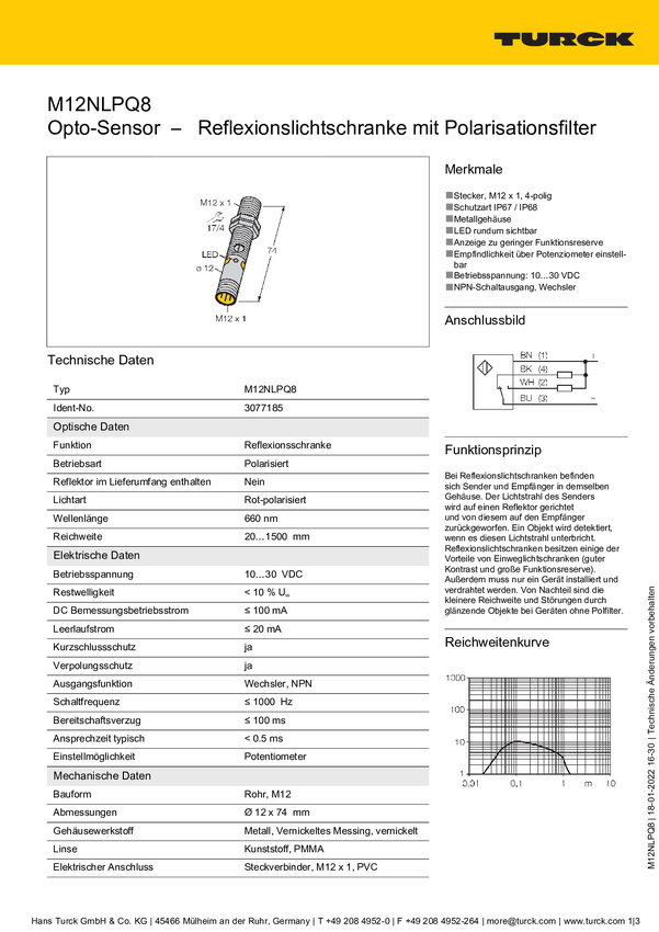 Fotokomórka odbiciowa Turck M12NLPQ8 3077185 1 szt.