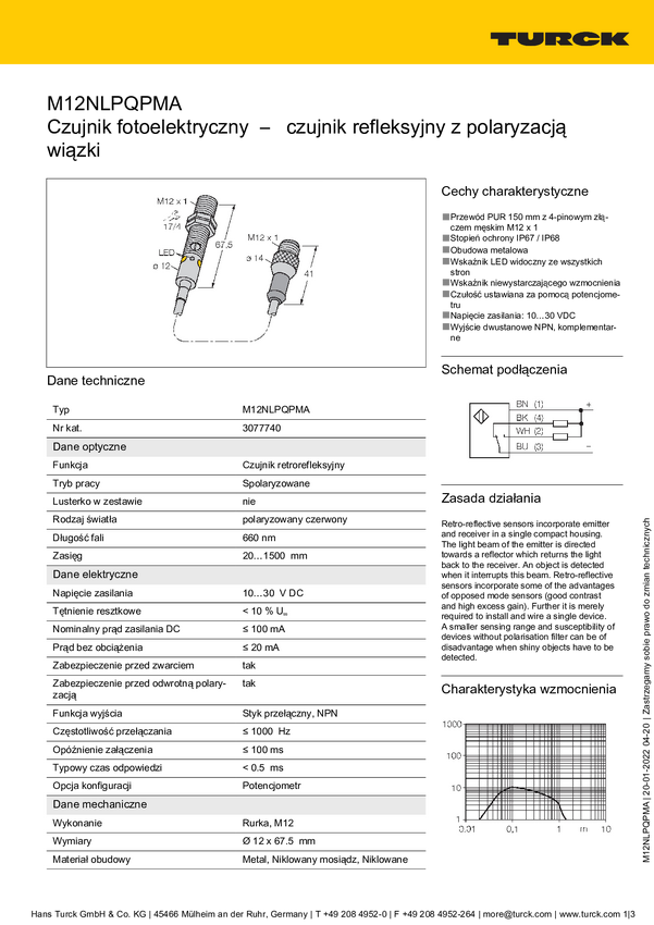 Fotokomórka odbiciowa Turck M12NLP W/30 3077207 1 szt.