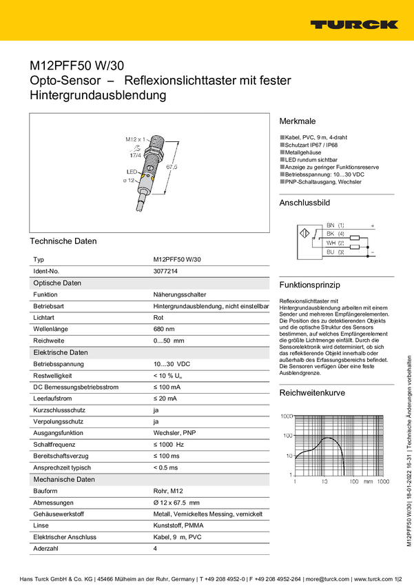 Czujnik dyfuzyjny Turck M12PFF50 W/30 3077214 1 szt.