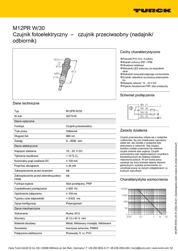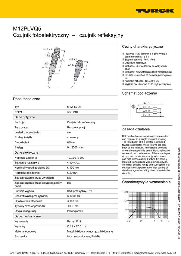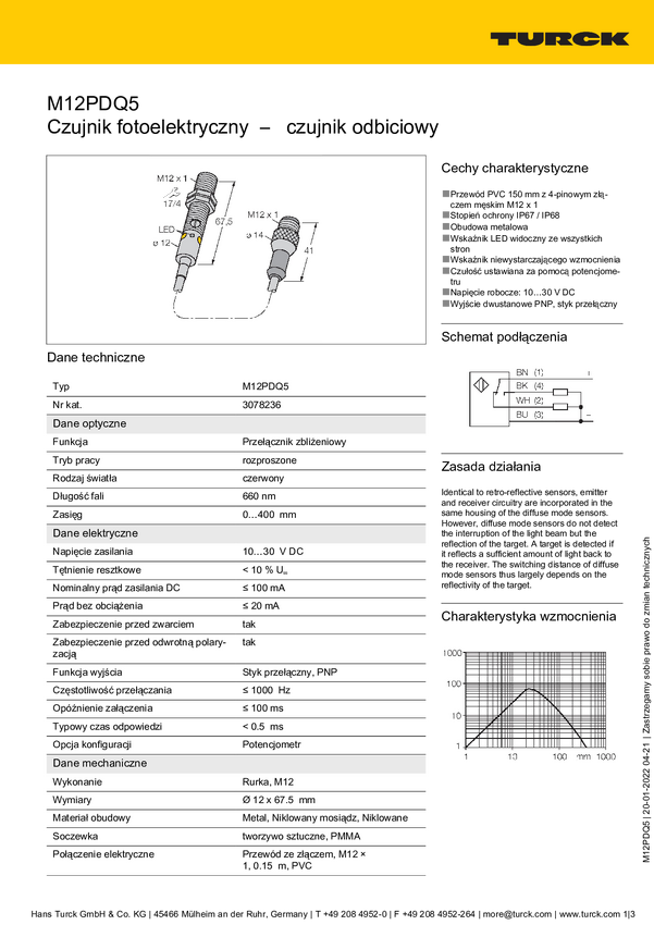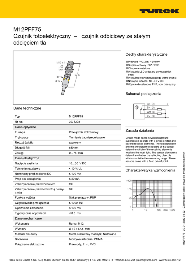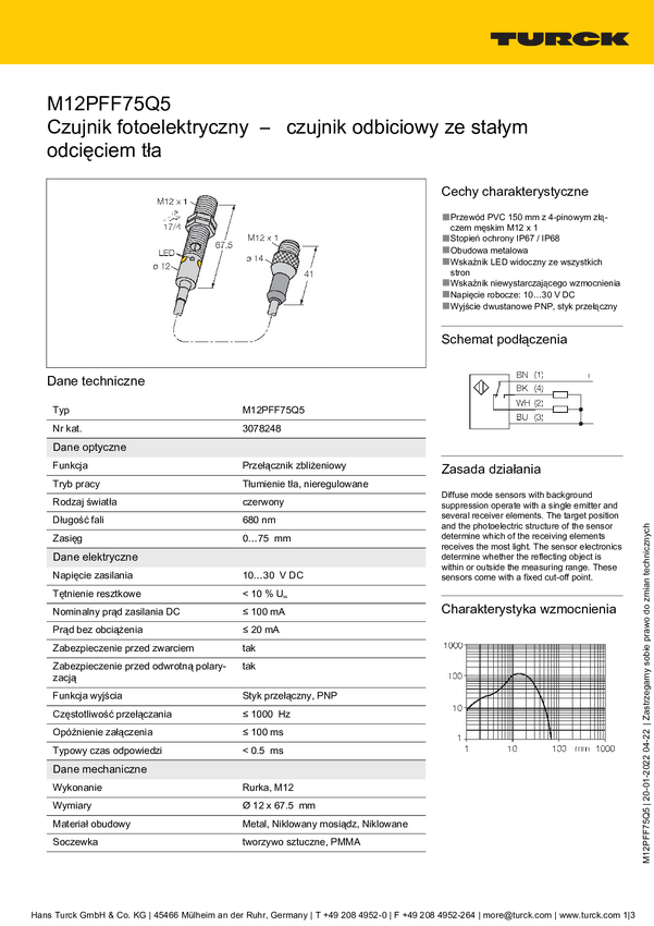 Czujnik dyfuzyjny Turck M12PFF75 W/30 3078232 1 szt.