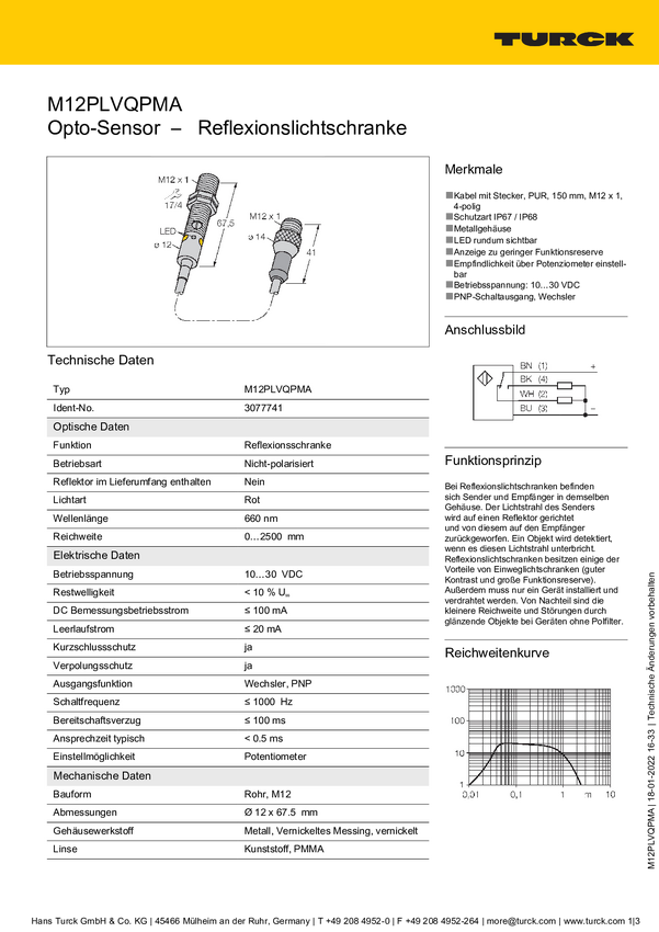 Fotokomórka odbiciowa Turck M12PLV W/30 3077208 1 szt.