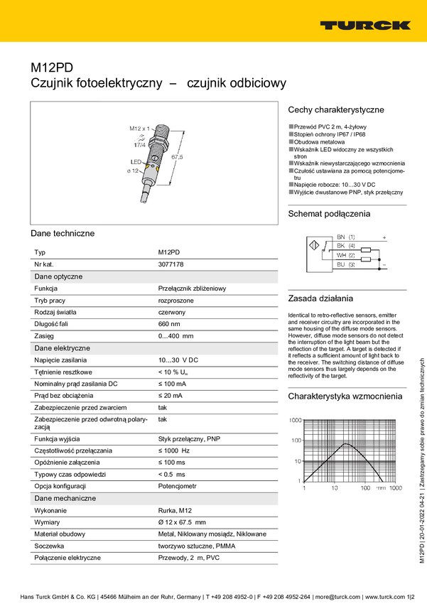 Czujnik dyfuzyjny Turck M12PD 3077178 1 szt.
