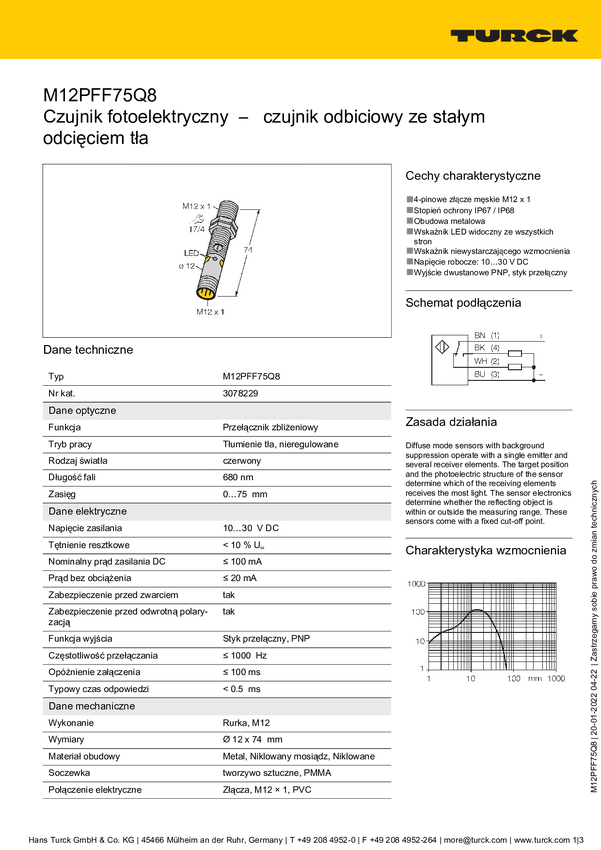Czujnik dyfuzyjny Turck M12PFF75 3078228 1 szt.