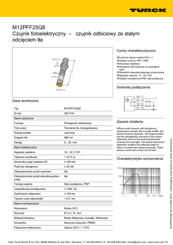 Czujnik dyfuzyjny Turck M12PFF25 3077190 1 szt.