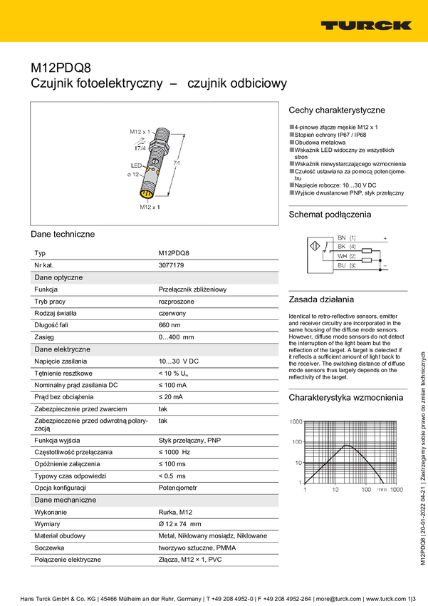 Czujnik dyfuzyjny Turck M12PDQ8 3077179 1 szt.