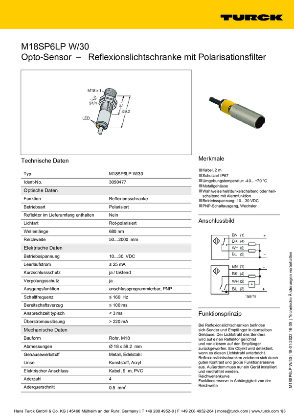 Fotokomórka odbiciowa Turck M18SP6LP W/30 3050477 1 szt.