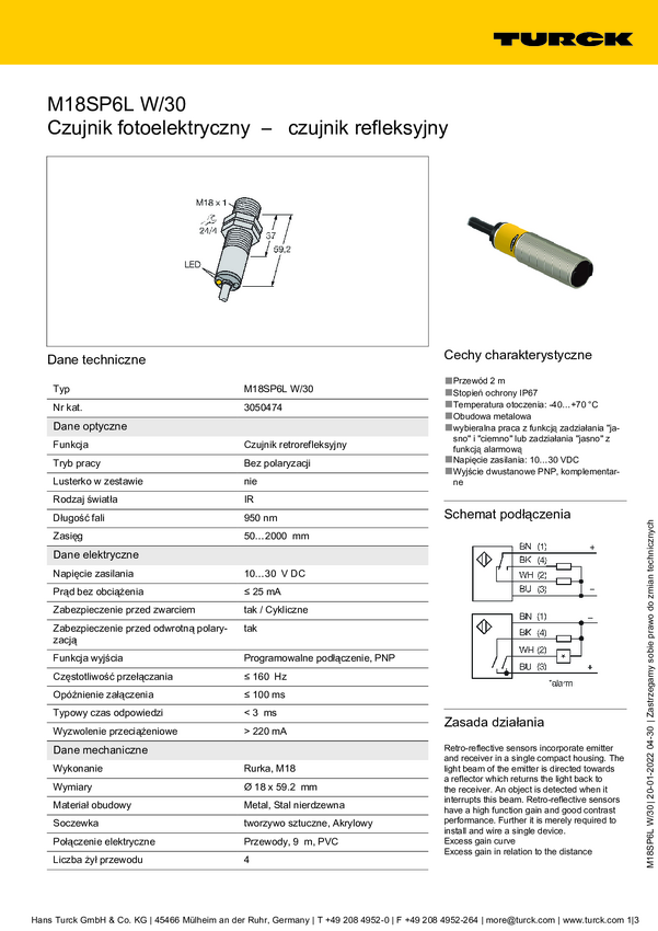 Fotokomórka odbiciowa Turck M18SP6L W/30 3050474 1 szt.