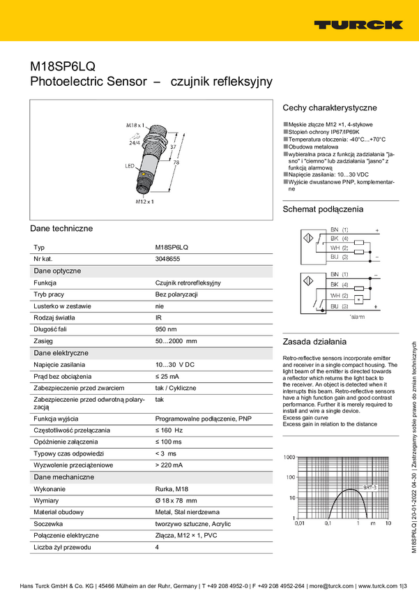 Fotokomórka odbiciowa Turck M18SP6L 3048654 1 szt.