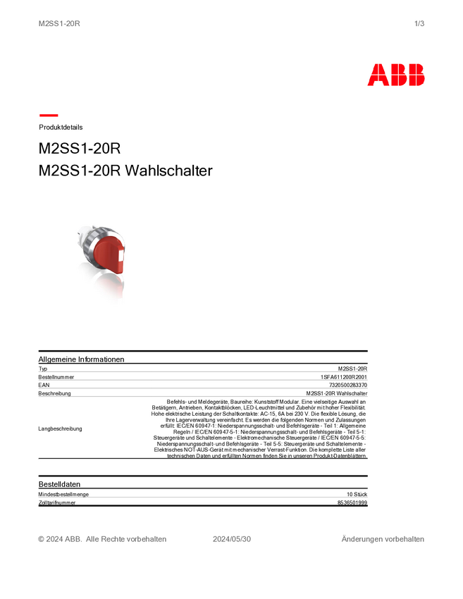 ABB 1SFA611200R3006 M2SS1-30B Mocowanie przełącznika wyboru przełącznik obrotowy 1 szt.