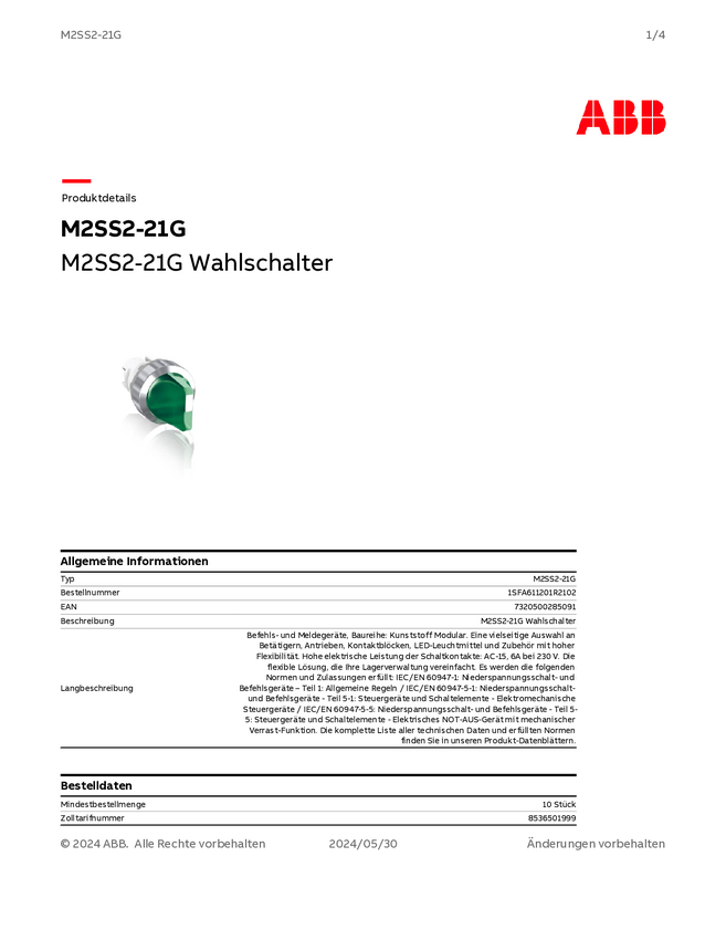 ABB 1SFA611201R2102 M2SS2-21G Przełącznik wyboru zielony, chrom 1 szt.