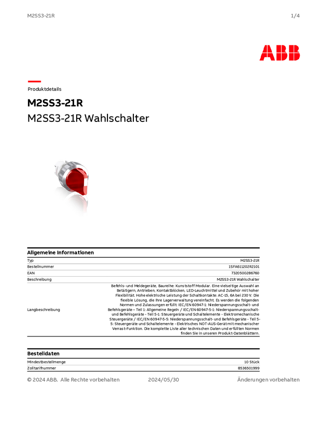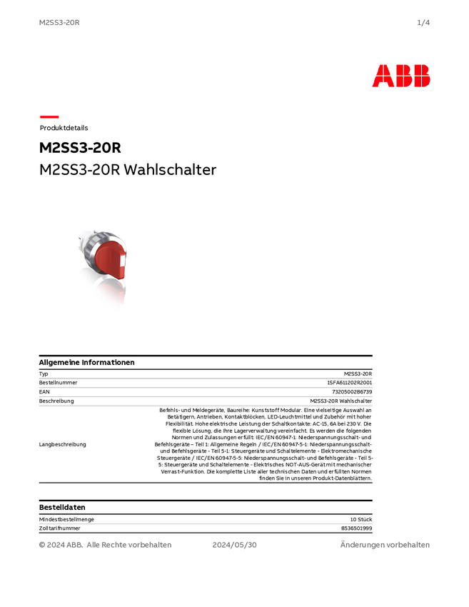 ABB 1SFA611202R2001 M2SS3-20R Mocowanie przełącznika wyboru przełącznik obrotowy 1 szt.
