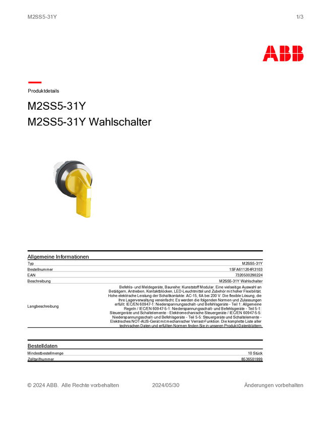 ABB 1SFA611204R3103 M2SS5-31Y Podświetlany przełącznik wybierakowy przełącznik obrotowy 1 szt.