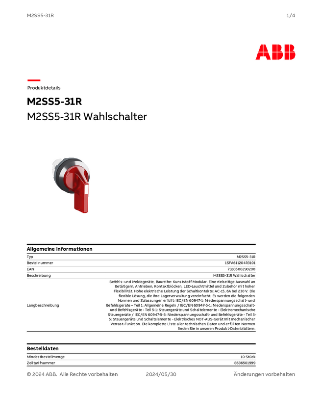 ABB 1SFA611204R3001 M2SS5-30R Mocowanie przełącznika wyboru przełącznik obrotowy 1 szt.