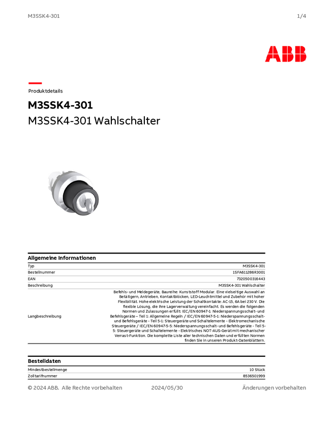 ABB 1SFA611253R3006 M3SSC4-30B Przełącznik wyboru przełącznik obrotowy 1 szt.