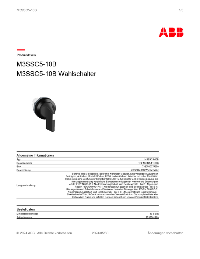 ABB 1SFA611254R1006 M3SSC5-10B Przełącznik wyboru przełącznik obrotowy 1 szt.