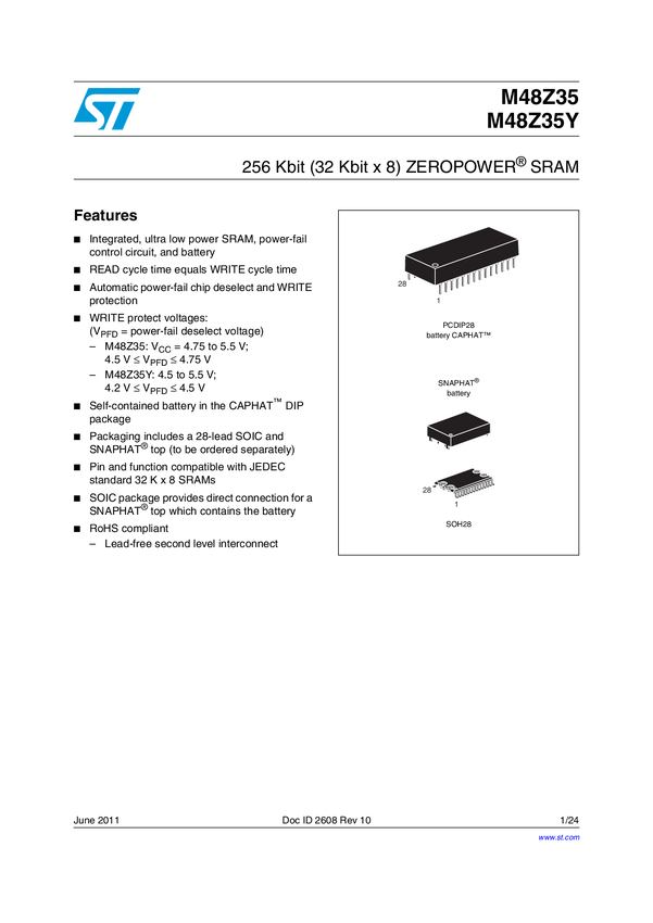 STMicroelectronics M48Z35-70PC1 Pamięć IC DIP-28 NVSRAM 256 kBit 32 K x 8