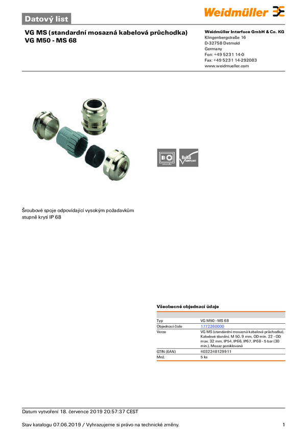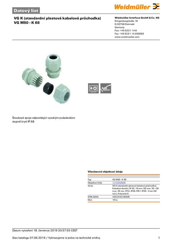 Weidmüller 1772340000 Dławnica kablowa VG M50 - K 68, od 30 mm, do 38 mm, M50, 10 szt.
