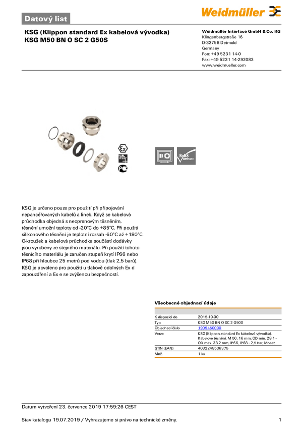 Weidmüller 1909340000 Dławnica kablowa KDSU M50 BN O SC 2 G50S, od 39.4 mm, do 46.7 mm, M50, 1 szt.
