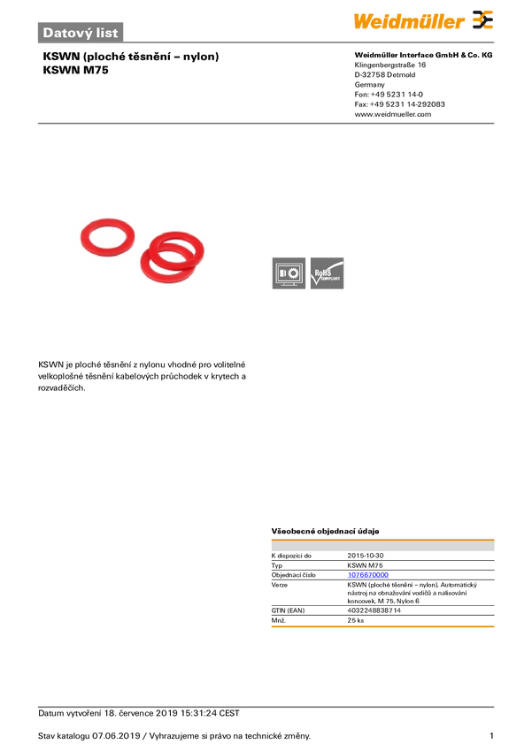 Weidmüller 1076670000 Uszczelka pierścieniowa KSWN M75, M75, 25 szt.