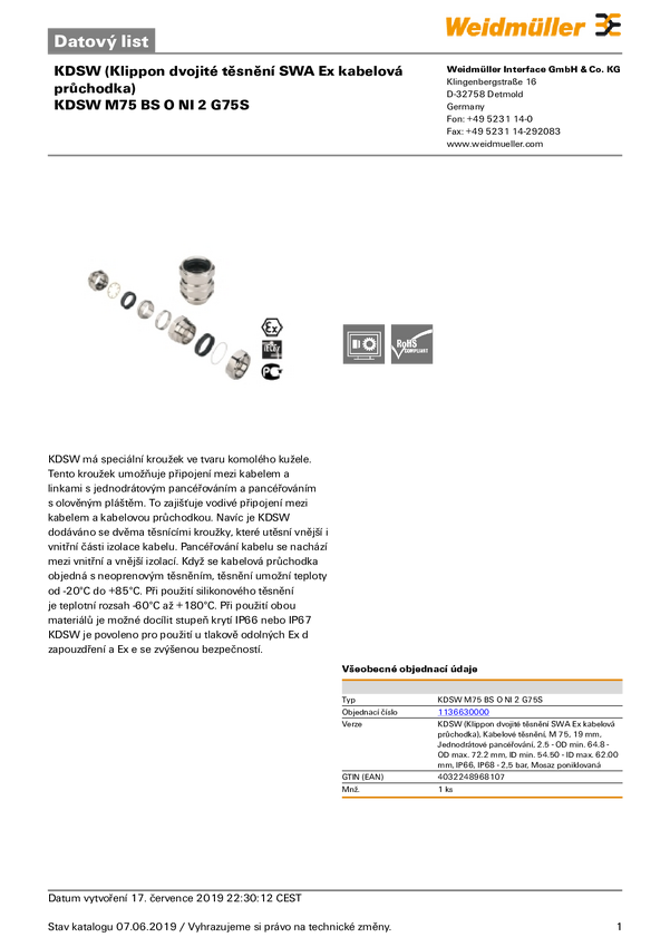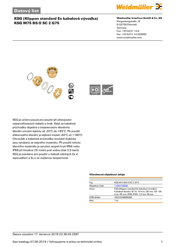 Weidmüller 1136700000 Dławnica kablowa M75 mosiądz mosiądz 1 szt.