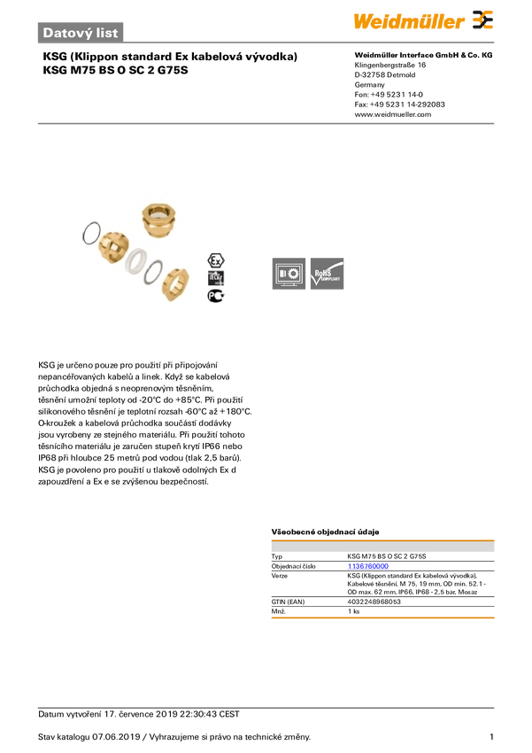 Weidmüller 1136760000 Dławnica kablowa M75 mosiądz mosiądz 1 szt.