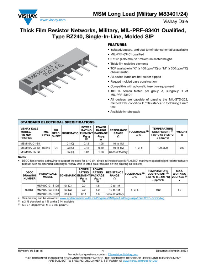 Thick Film Resistor Networks, Military, MIL-PRF-83401 Qualified, Type RZ240, Single-In-Line, Molded SIP