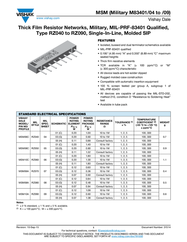 Thick Film Resistor Networks, Military, MIL-PRF-83401 Qualified, Type RZ040 to RZ090, Single-In-Line, Molded SIP