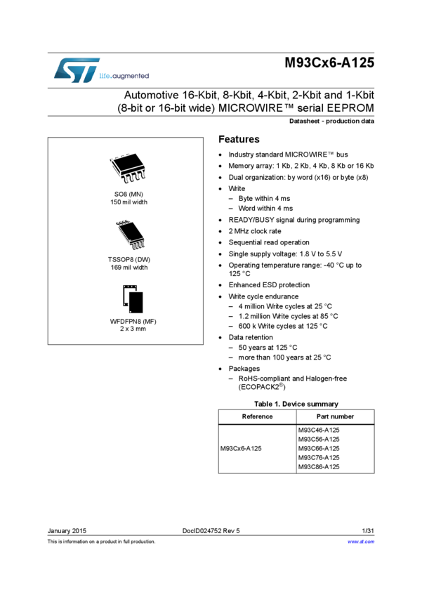 1 Kbit (8-bit or 16-bit wide) MICROWIRE serial access EEPROM